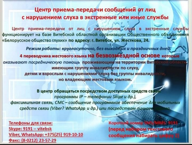 Информация о центре приема-передачи сообщений от лиц с нарушением слуха в экстренные или иные службы