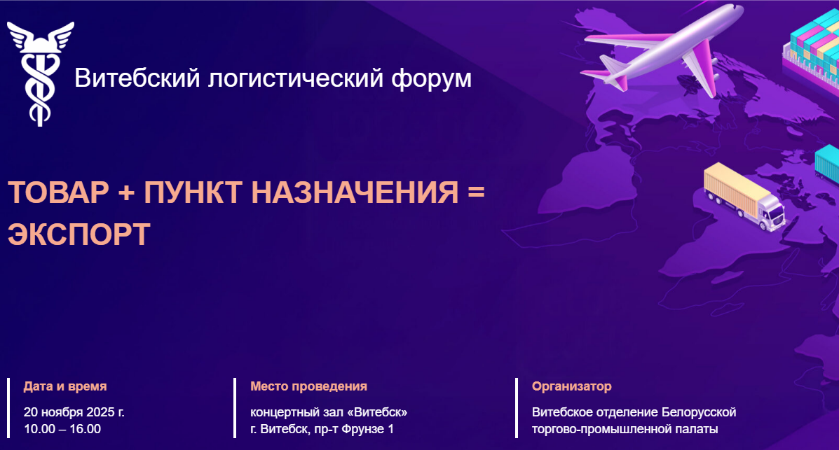 Витебское отделение Белорусской торгово-промышленной палаты 20 ноября 2025 года в г. Витебск (концертный зал "Витебск", пр-т Фрунзе 1) организует Витебский логистический форум "Товар + пункт назначения = экспорт"