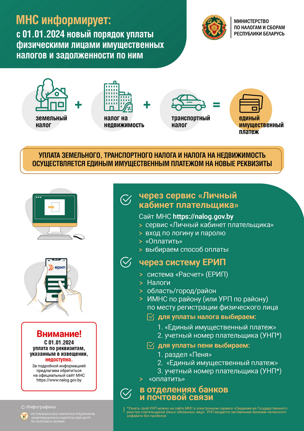 МНС информирует: с 01.01.2024 г. новый порядок уплаты физическими лицами имущественных налогов и задолженности по ним