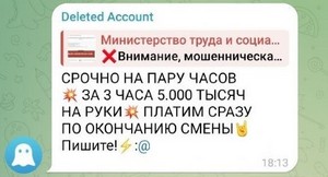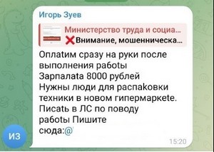 Напрямую мошенники в интернете не могут размещать объявления о поиске таких лиц, поэтому свой интерес они прикрывают предложением различного другого заработка, не вызывающего подозрения. Например, в Telegram рассылают объявления о поиске курьеров в любом городе со стабильной оплатой труда или людей для разгрузки товаров, или людей на вакансию «тайный покупатель», или заманивают обещанием высокой и быстрой оплаты.