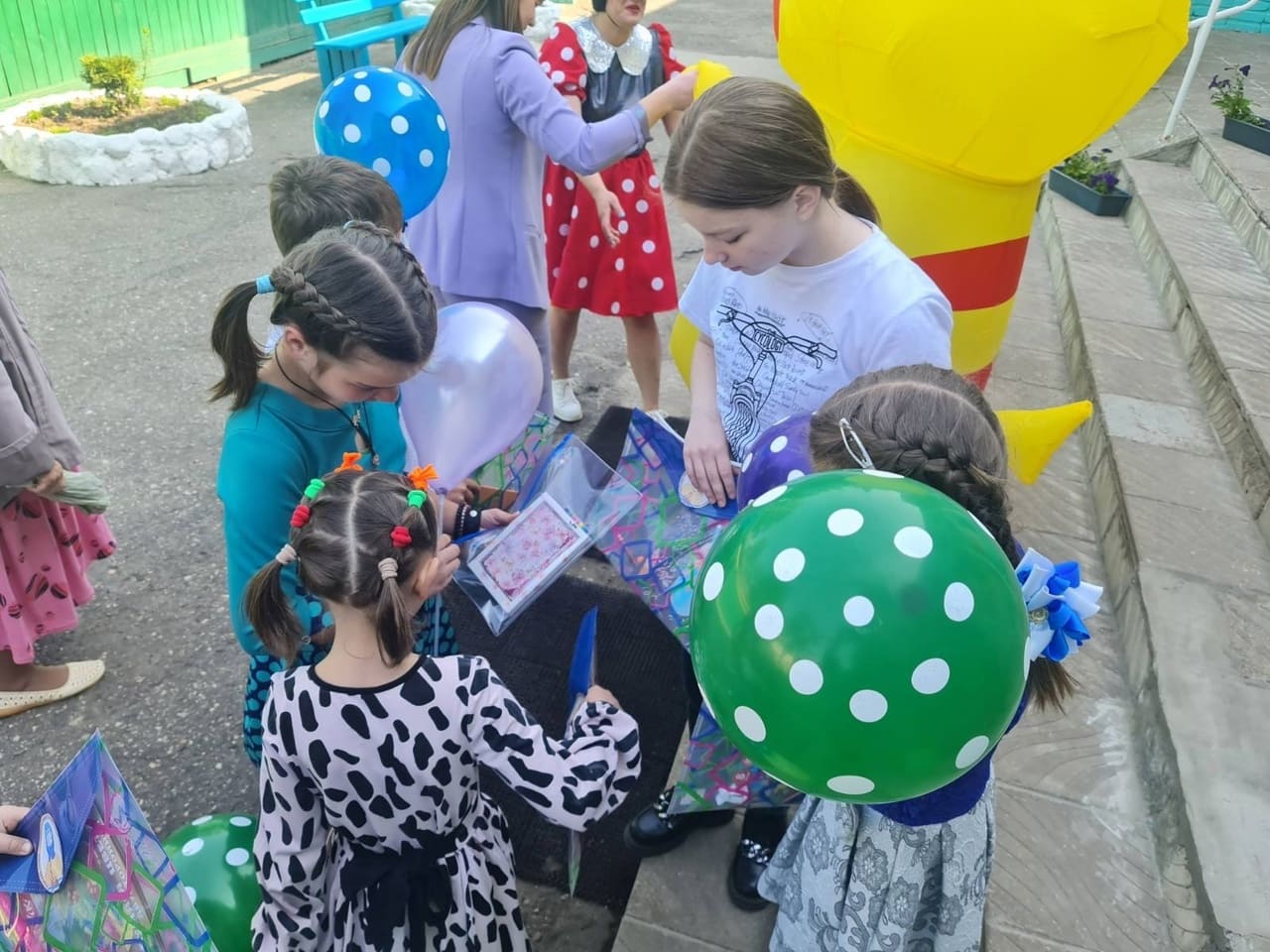 Ребята поучаствовали в интерактивной игре с ростовыми куклами, потанцевали под зажигательную музыку, получили воздушные шары и сделали фотографии на память с любимыми персонажами.