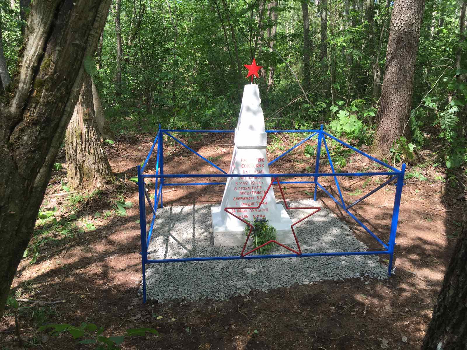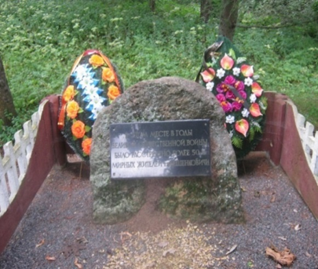 Памятник установлен в 1979 г., заменен в 2007 г. Памятник в виде надгробия из камня, на котором закреплена гранитная доска с надписью: «В этом месте в годы Великой Отечественной войны было расстреляно более 50 мирных жителей г. п. Бешенковичи». Ограда бетонная.