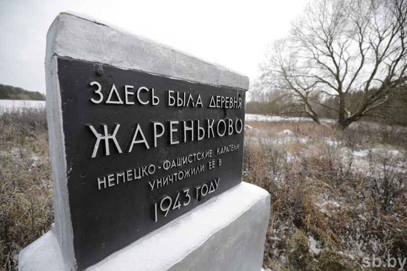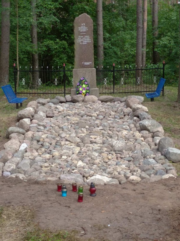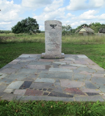 На памятнике надпись на русском языке и идиш: «Вечная память 1068 советским гражданам, погибшим от рук гитлеровцев 11.02.1942 г.»