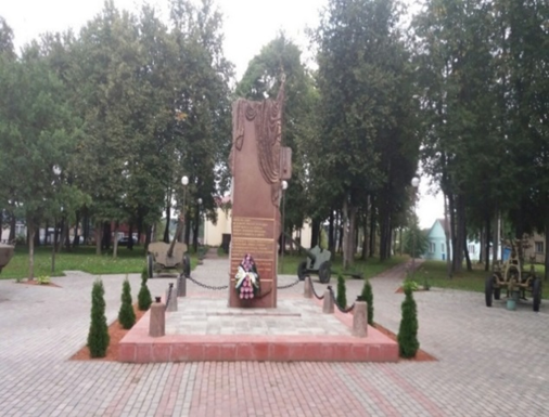 Стела из гранитных блоков, облицованная декоративным щитом с надписями: «Пусть ты умер! Но в песне смелых и сильных духом всегда ты будешь живым примером призывом гордым к свободе, к свету!», «Сооружен в память комсомольцев и молодежи района, павших в героической борьбе против фашизма в Великой Отечественной войне 1941 – 1945 гг.», «Открыт 24 сентября 1970г. к 50-летию Ленинского Коммунистического Союза Молодежи Белоруссии». Огражден 7 гранитными столбами с металлическими цепями. Вокруг памятника посажены туи.